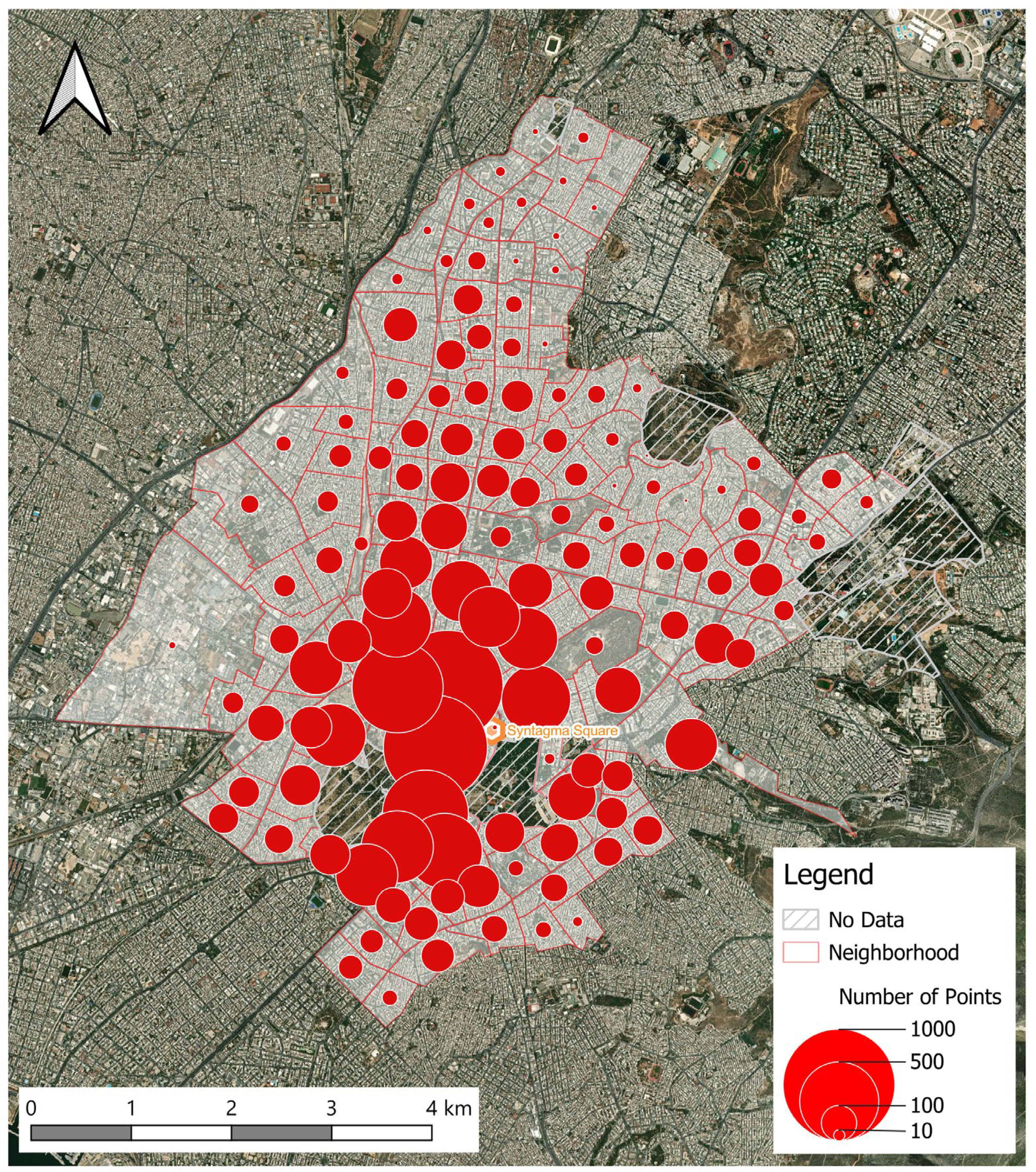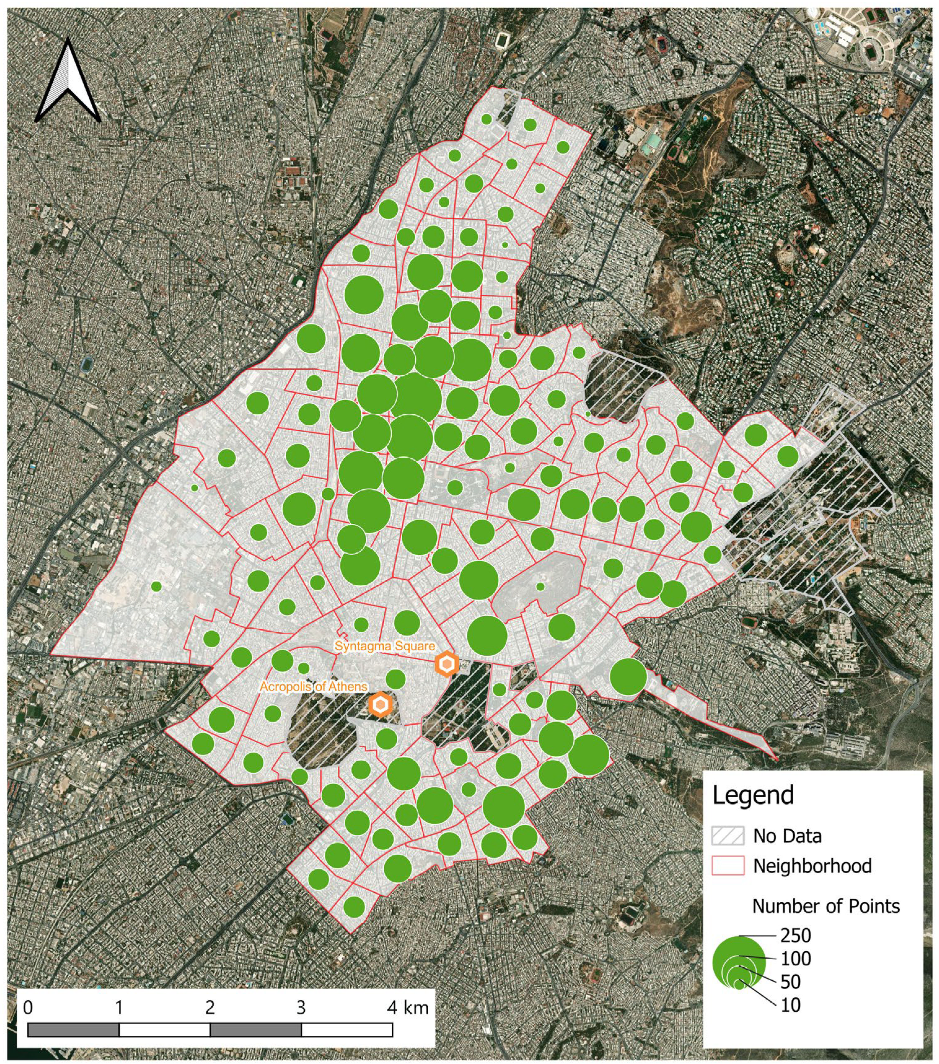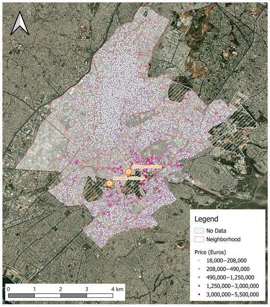 Data on house prices concern asking prices and were obtained from real estate webpages in April 2024. The dataset includes information on price, the type of the property (apartment, terraced houses, and single-family houses), size, year of construction, bedrooms, floor, type and means of heating, a classification as to the energy efficiency, geographic coordinates, and a description of the property in text format. Several of the variables were in text format; thus, data transformations were necessary. Furthermore, additional information concerning missing values—for example, for the floor, as well as new variables, i.e., parking and furnished property—was extracted from the text describing the property. Since the data were large and hard to use manually, an automatization of the process of data extraction was developed, by implementing programming techniques. More specifically, a Python script (ver. 3) was written and executed in order to extract the examined variables and produce an appropriate output in Excel format. Also, two new variables were created using GIS operations (ArcGIS Pro v.3.5.4), regarding the locational attributes of properties, i.e., distances from the city center and the subway stations. Not all the variables were included in regression analysis, mostly because of a large number of missing values or variables with questionable reliability. The initial dataset included 11,460 houses of all types for sale. However, it was necessary to clean the data since a great number of duplicate listings were identified, while several listings concerned non-residential property and were deleted. In addition, listings with obviously wrong values, as well as listings referring to furnished dwellings or listed buildings, were also excluded. In order to have a homogenous dataset, only apartments and terraced houses within residential buildings were retained, while single-family houses were excluded from the analysis. Furthermore, a great number of missing values significantly reduced the number of observations. The visualization of the data in a GIS environment indicated many houses either with wrong coordinates, resulting in points out of the study area or within public space, as well as observations with missing coordinates. Therefore, the final dataset for the regression analysis included 8005 houses for sale. In Figure 2, the number of houses for each neighborhood is presented, together with two POIs: the city center (Syntagma square) and the Acropolis archeological site.