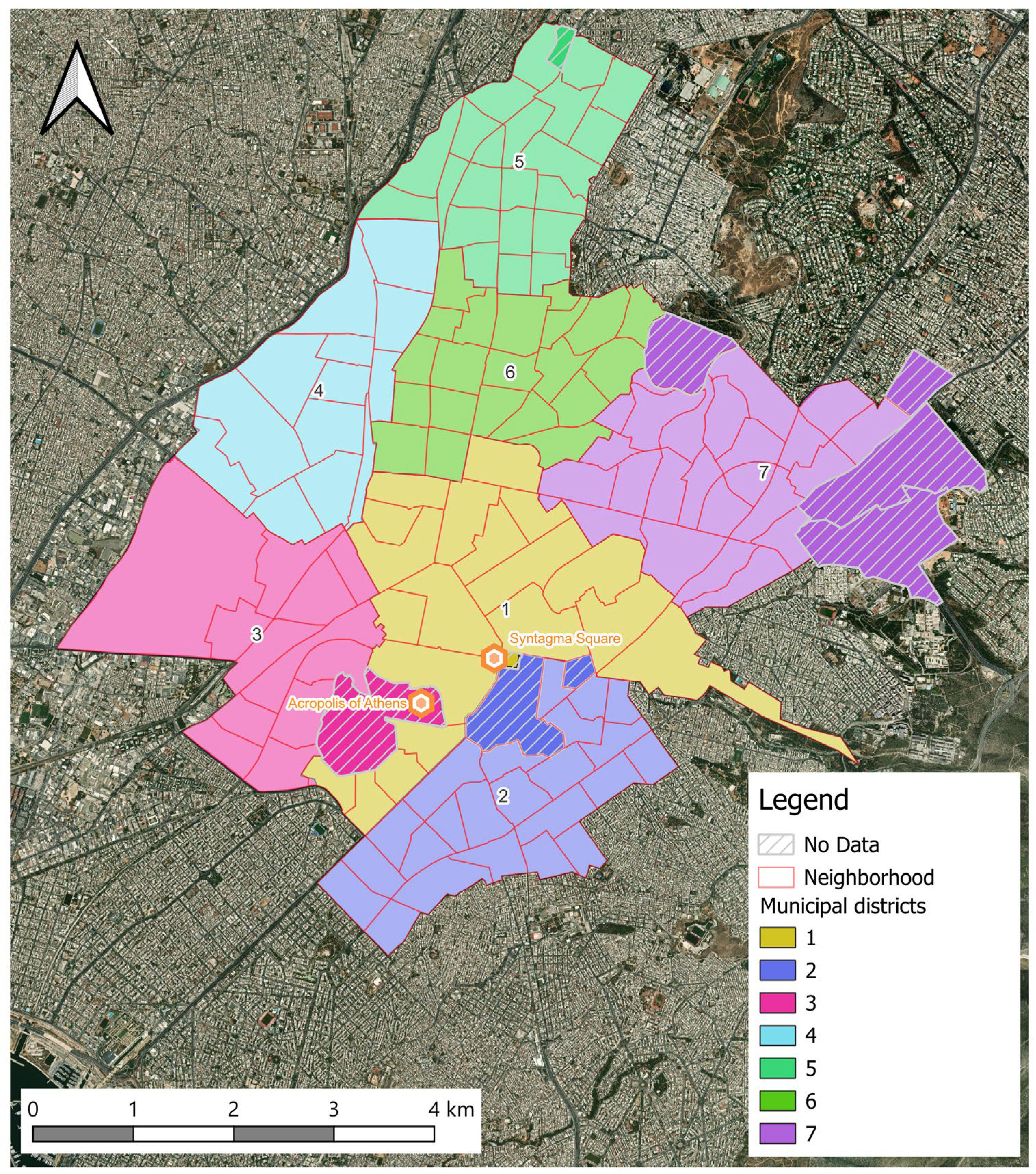 In order to address, among other issues, the shortage of affordable housing, the Greek government has recently adopted several measures, including suspension of new licenses in regions with very intense short-term rentals activity. In Athens, these restrictions are applied since the beginning of 2025 for some parts of the city (municipal districts 1, 2, and 3 in Figure 1).