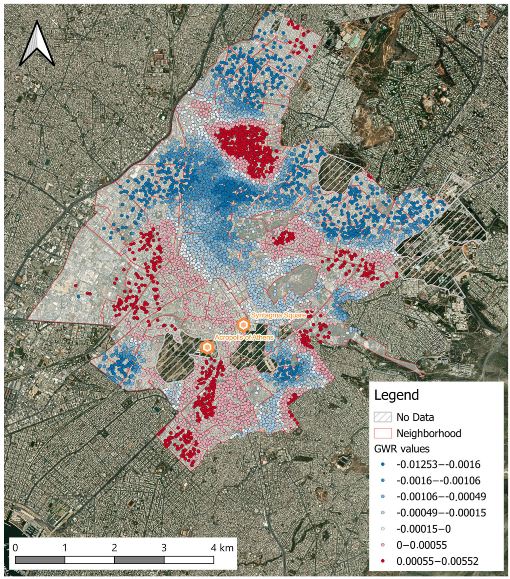 Geographically Weighted Regression (GWR) is a different spatial regression model that produces different regression equations for each feature. GWR is based on the idea that, in the case of spatially autocorrelated data, the global model does not produce accurate results for all the features engaged in the regression analysis. Therefore, GWR coefficients are not the same in the whole study region, and they are different for each location [37]. Each regression equation engages the observations falling within a bandwidth, which includes the neighboring locations. Moreover, the values of the dependent variable for the observations within the bandwidth are weighted according to their distance from the target location. The spatial differentiation of the regression coefficients in GWR is an expression of the importance of each independent variable in different locations. The maps of the regression coefficients describe the spatial variation in the impact of each variable. In addition, the values of the regression coefficients for each house can produce, through interpolation, raster surfaces to extract the regression coefficients at any location within the study region. Therefore, the value of the dependent variable can be predicted at any location, if the values for the independent variables are known.