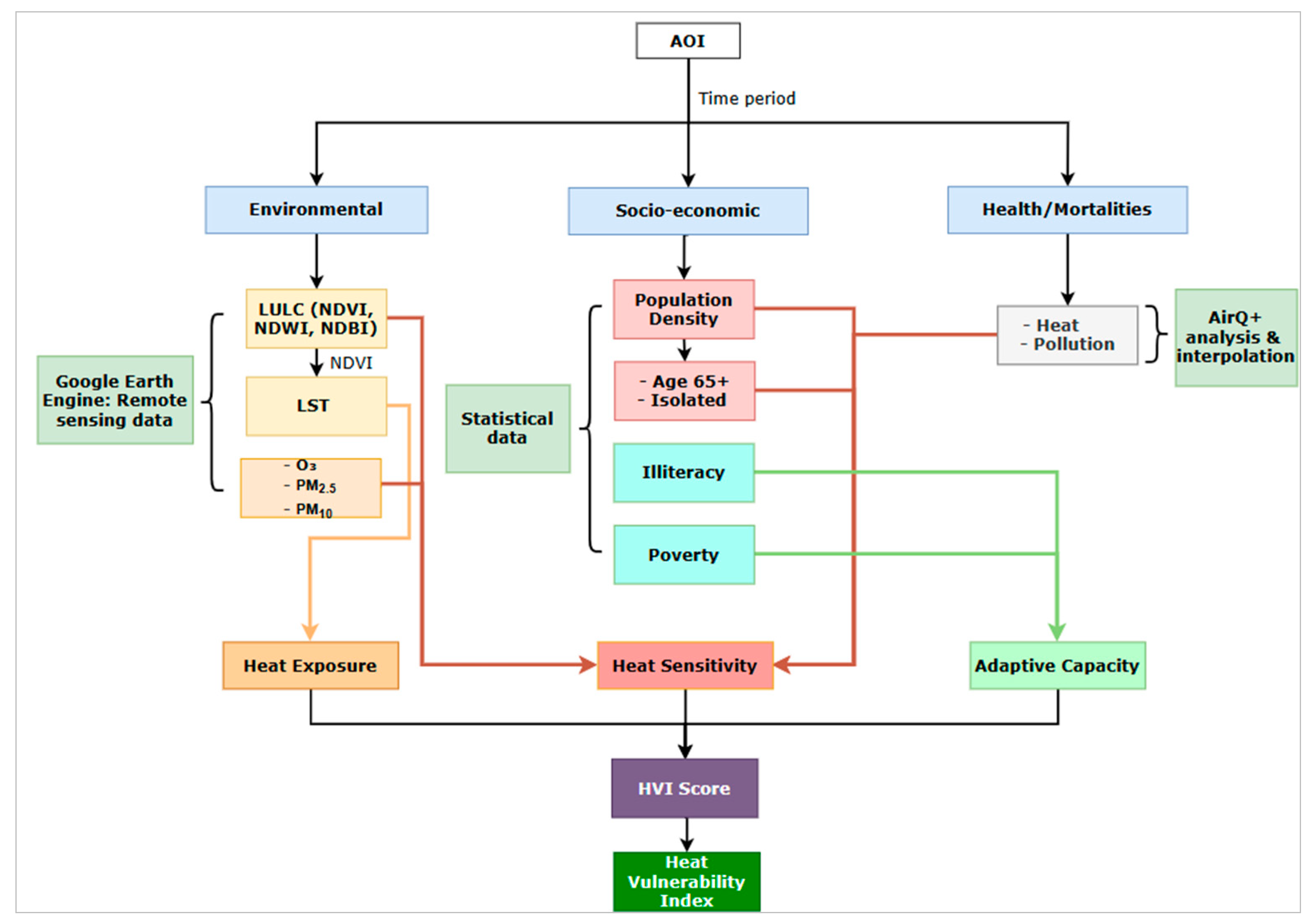 | Heat sensitivity: the extent to which people are likely to be negatively affected by heat exposure, depending upon environmental and demographic factors | Air quality (PM10, PM2.5, and O3)—1 km2 | ECMWF/CAMS/NRT and Sentinel-5P [20,21] |