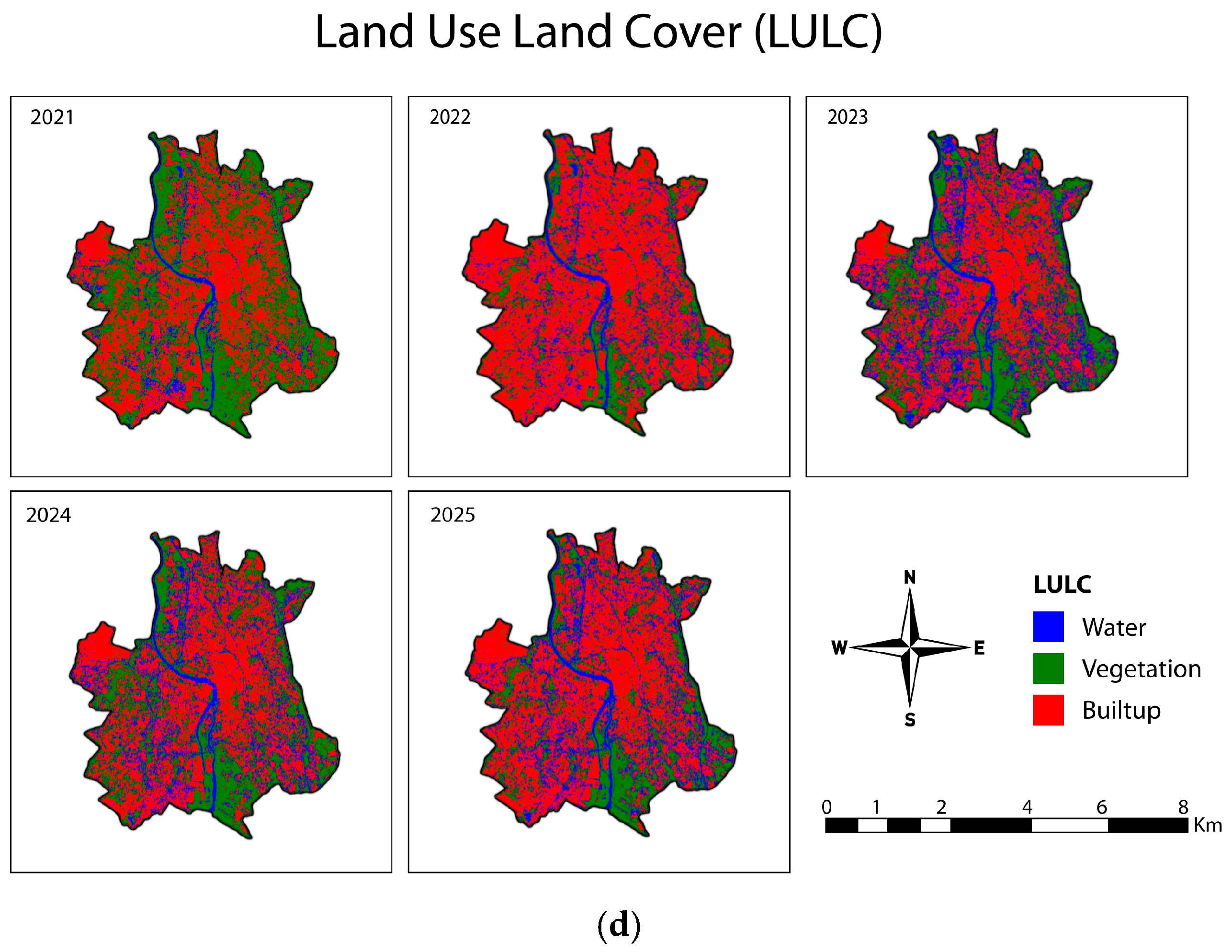 | LULC (NDVI, NDWI, NDBI)—900 m | MODIS and Landsat 8 [19,22] | |