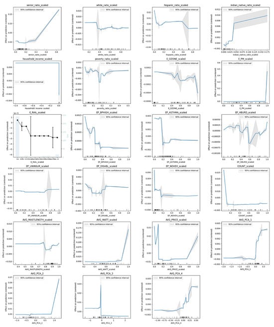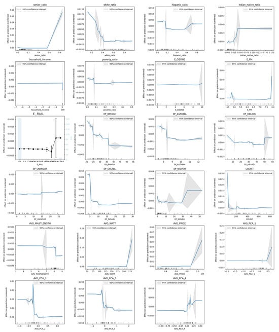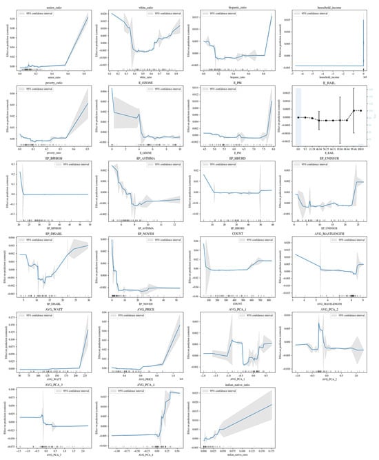 Before the epidemic (Figure 9), jointly elevated pollutant concentrations produced broad declines in visitation, while socio-economic × health interactions—such as high asthma prevalence combined with high uninsured rates—exhibited strong nonlinear suppressive zones. After the epidemic (Figure 10), these effects became more spatially localized: environmental interactions weakened overall, whereas socio-economic × financial stress couplings (e.g., housing burden × uninsured ratio) intensified markedly. Disability paired with poverty or low vehicle access remained consistently negative across both phases, though with reduced magnitude after the epidemic.