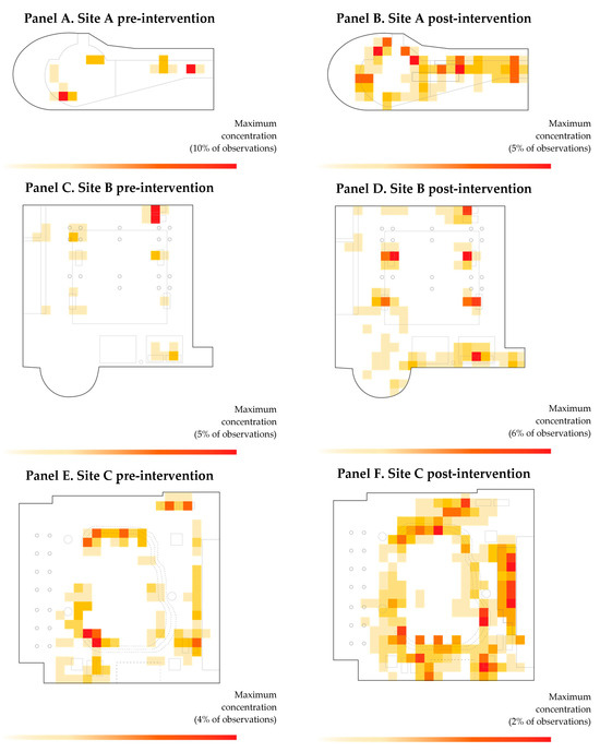 Spatial distribution of observations, showing the relative frequency of activities in relation to space before and after the intervention. The maximum frequency is indicated in red.