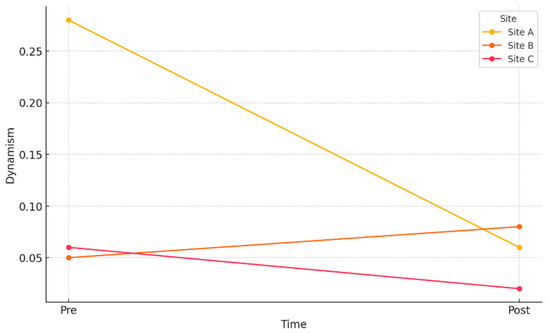 Temporal variation in dynamism across Sites A, B, and C before (pre) and after (post) the intervention.