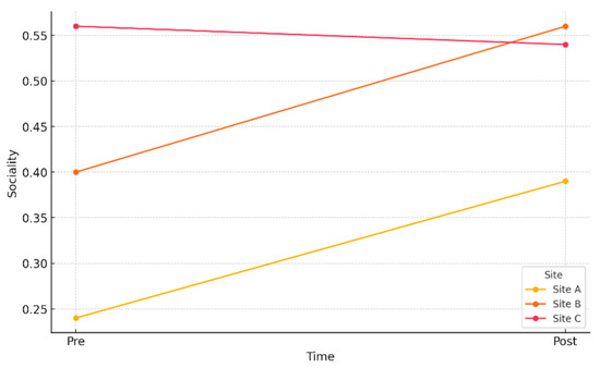 The logistic regression model was statistically significant (χ2(5) = 21.2, p < 0.001), accounting for approximately 2% of the total variance in the data. Tests of individual factors indicated a significant effect of site (χ2(2) = 16.63, p < 0.001) and a significant effect of the intervention (χ2(1) = 4.26, p < 0.05), while the site-by-intervention interaction was not significant (χ2(2) = 4.18, p = 0.124). Specifically, the likelihood of social activities was significantly higher at Site B compared to Site A, with social activities approximately 1.43 times as likely (Exp(B) = 1.43, z = 2.45, p < 0.05). The difference between Site C and Site B was not significant (Exp(B) = 1.16, z = 1.49, p = 0.136). However, social activities were significantly more likely at Site C compared to Site A, with an increase of approximately 1.65 times (Exp(B) = 1.65, z = 3.81, p < 0.001). Although social activities showed an overall increase after the intervention (Exp(B) = 1.23, z = 2.02, p < 0.05), no significant changes were observed in specific sites: Site A (Exp(B) = 1.97, z = 1.41, p = 1.000), Site B (Exp(B) = 1.88, z = 1.92, p = 0.819), and Site C (Exp(B) = 0.95, z = −0.25, p = 1.000). Figure 3 illustrates the trend of observed data related to social activities.