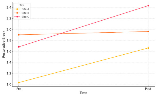Regarding restorative breaks, the intervention was associated with a notable increase in the frequency of such activities. This effect was most substantial and statistically significant at Site C. While Site A also exhibited a positive trend in restorative activities post-intervention, this change did not reach statistical significance after correction. These findings suggest that the intervention can promote restorative behaviors, particularly in locations where conditions are conducive to relaxation [48]. Additionally, the statistically insignificant results observed at Site B, with virtually no changes recorded, further underscored the importance of the intervention. This reinforced the conclusion that the intervention itself played a crucial role in the observed changes, particularly at the other sites, where it had a more pronounced impact.