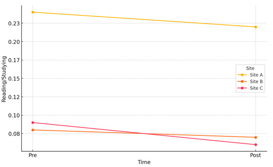 Temporal variation in reading/studying across Sites A, B, and C before (pre) and after (post) the intervention.