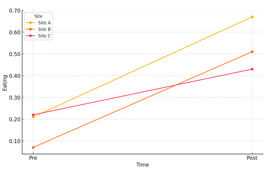 The Poisson regression was statistically significant (χ2(5) = 58.5, p < 0.001), explaining approximately 4% of the total variance. Tests of individual factors indicated a marginally statistically significant effect of site (χ2(2) = 5.44, p = 0.066), a significant effect of the intervention (χ2(1) = 47.47, p < 0.001), and a significant site-by-intervention interaction (χ2(2) = 7.54, p < 0.05). Specifically, the number of people eating was significantly higher at Site A compared to Site B, with eating being approximately 1.42 times more frequent (Exp(B) = 1.42, z = 2.09, p < 0.05). The difference between Site C and Site B was marginally statistically significant (Exp(B) = 1.29, z = 1.81, p = 0.070). Finally, the difference between Site A and Site C was not statistically significant (Exp(B) = 1.10, z = 0.81, p = 0.418). Regarding the effect of the intervention, eating activity showed a significant increase between the pre- and post-intervention phases (Exp(B) = 1.91, z = 5.517; p < 0.001). A post hoc analysis of the interaction effect indicated that this increase was particularly pronounced at Site C (Exp(B) = 1.98, z = 3.19, p < 0.05) and at Site B (Exp(B) = 7.64, z = 3.93, p < 0.001). In contrast, Site A showed an increase (Exp(B) = 3.22, z = 2.74) but this result was only marginally significant (p = 0.092). Figure 6 illustrates the trend of observed data related to eating activity.