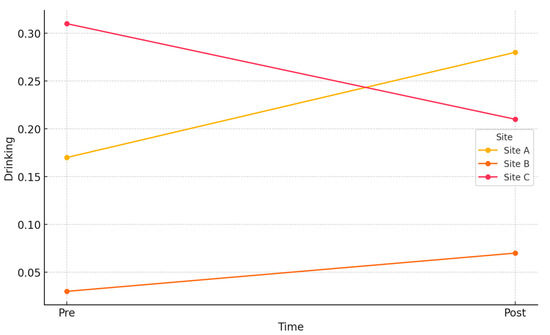 The Poisson regression was statistically significant (χ2(5) = 33.6, p < 0.001), explaining approximately 4% of the total variance. Tests of individual factors indicated a statistically significant effect of site (χ2(2) = 29.65, p < 0.001), a non-significant effect of the intervention (χ2(1) = 0.98, p = 0.323), and a marginally significant site-by-intervention interaction (χ2(2) = 5.10, p = 0.078). Specifically, the number of people drinking was significantly higher at Site A compared to Site B, with drinking being approximately 2.11 times more frequent (Exp(B) = 2.11, z = 3.21, p < 0.001). Similarly, the number of people drinking was significantly higher at Site C compared to Site B, being approximately 1.53 times more frequent (Exp(B) = 1.53, z = 4.03, p < 0.001). However, the difference between Site C and Site A was not statistically significant (Exp(B) = 0.93, z = 0.59, p = 0.554). Regarding the effect of the intervention, drinking activity showed an increase between pre- and post-intervention (Exp(B) = 1.16, z = 0.94), but this increase was not statistically significant (p = 0.346). A post hoc analysis of the interaction effect further clarified that no significant changes were observed before and after the intervention at Site A (Exp(B) = 1.63, z = 1.01, p = 1.000), Site B (Exp(B) = 2.22, z = 1.01, p = 1.000), or Site C (Exp(B) = 0.68, z = −1.96, p = 0.754). Figure 7 illustrates the trend of observed data related to drinking activity.
