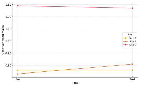 The Poisson regression model was statistically significant (χ2(5) = 44.4, p < 0.001), explaining approximately 4% of the total variance. Tests of individual factors indicated a statistically significant effect of site (χ2(2) = 36.33, p < 0.001), but neither the effect of the intervention (χ2(1) = 0.08, p = 0.774) nor the site-by-intervention interaction (χ2(2) = 0.35, p = 0.841) was statistically significant. Specifically, the number of observer-rated males was higher at Site B compared to Site A (Exp(B) = 1.01, z = 0.12), but this difference was not statistically significant (p = 0.908). Conversely, the number of observer-rated males was significantly higher at Site C compared to Site B (Exp(B) = 1.29, z = 4.84, p < 0.001). Consequently, there was also a statistically significant difference between Site C and Site A (Exp(B) = 1.30, z = 3.98, p < 0.001). Regarding the effect of the intervention, the presence of observer-rated males showed a slight increase between pre- and post-intervention phases (Exp(B) = 1.02, z = 0.29), but this increase was not statistically significant (p = 0.774). A post hoc analysis of the interaction effect further clarified that no significant changes were observed before and after the intervention at Site A (Exp(B) = 1.00, z = 0.01, p = 1.000), Site B (Exp(B) = 1.11, z = 0.57, p = 1.000), or Site C (Exp(B) = 0.98, z = −0.17, p = 1.000). Figure 8 illustrates the trend of observed data related to the presence of observer-rated males.