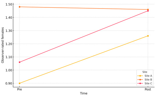The Poisson regression model was statistically significant (χ2(5) = 17.8, p < 0.01), explaining approximately 2% of the total variance. Tests of individual factors indicated a statistically significant effect of site (χ2(2) = 7.91, p < 0.05), a statistically significant effect of the intervention (χ2(1) = 5.81, p < 0.05), and a non-significant site-by-intervention interaction (χ2(2) = 4.22, p = 0.121). Specifically, the number of observer-rated females was significantly higher at Site B compared to Site A (Exp(B) = 1.18, z = 2.57, p < 0.05) and significantly higher at Site B compared to Site C (Exp(B) = 1.09, z = 2.08, p < 0.05). However, the difference between Site C and Site A was not statistically significant (Exp(B) = 1.08, z = 1.29, p = 0.196). Regarding the effect of the intervention, the presence of observer-rated females showed a statistically significant increase between pre- and post-intervention phases (Exp(B) = 1.11, z = 2.34, p < 0.05). A post hoc analysis of the interaction effect clarified that no significant changes were observed before and after the intervention at Site A (Exp(B) = 1.40, z = 1.58, p = 1.000) and Site B (Exp(B) = 0.99, z = −0.10, p = 1.000). However, at Site C there was a statistically significant difference between the pre- and post-intervention phases (Exp(B) = 1.37, z = 3.12, p < 0.05). Figure 9 illustrates the trend of observed data related to the presence of observer-rated females.