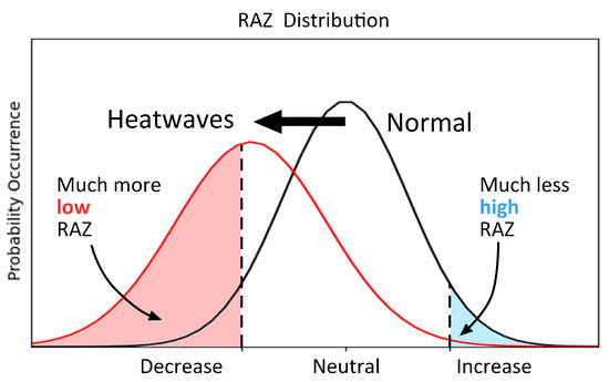 Distribution of RAZ during heatwaves versus normal conditions.