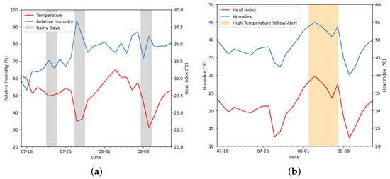 The temporal distribution of the RAZ indicator suggests local sensitivity to heatwaves. The result of the Pearson coefficient between the RAZ indicator and (statistic = −0.55, p-value = 0.04) indicates a strong correlation with heat stress. The results of humidex, heat index, and are consistent with the high-temperature yellow warning issued by the Beijing Meteorological Bureau, indicating that Beijing experienced extremely high temperature weather in early August. Thus, the heatwave period (from August 1st to 7th) is identified based on these results. Figure 2 presents the climate indicators for the study period.