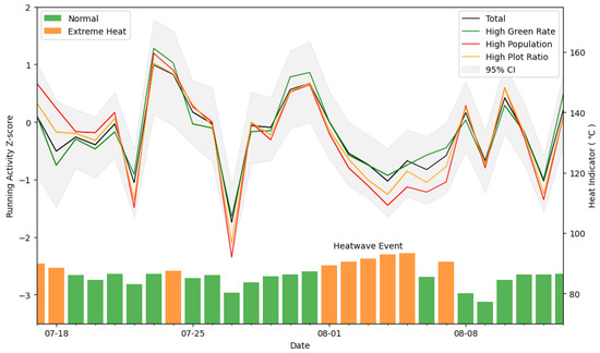 Daily distribution of heat index (bars) and mean Running Activity Z-score (lines). Specifically, there are four daily average RAZ curves for the total study area and areas with high green coverage, high population density, and plot ratio (top 25%). Mondays are labeled in the x-axis.