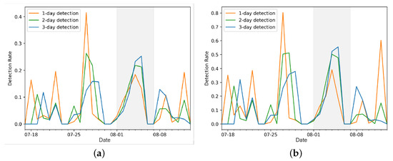 Figure 4 illustrates the results of significant low RAZ value detection across varying spatiotemporal resolutions. For the 1-day detection, the proportion of significantly low RAZ values during heatwaves and rainy days is found to be significantly higher than the hypothesized 0.05 threshold at both the 500 m and 1500 m geographical resolutions. This indicates that the RAZ index is sensitive to and effective at capturing the impacts of these key meteorological factors.