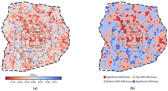 where i and t denote the grid index and time, respectively, enabling an assessment of how heatwaves influence citizen behavior within each grid. Based on this, the spatial autocorrelation of the RAZ distribution can be analyzed and verified using a Moran’s I test. The spatial autocorrelation patterns and statistically significant () clusters can be analyzed using local Moran’s I statistics. The analysis revealed distinct hot spots and cold spots, representing areas of high heat resilience (HHR) and low heat resilience (LHR), respectively.