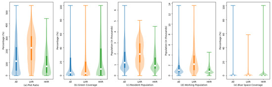 The results of area sensing indicate a significant correlation between SHR and urban factors. Compared with the overall data distribution, the extracted high SHR area (HHR) and low SHR area (LHR) exhibit pronounced differences in urban indicators including green coverage. The results of the K–S test indicated significant differences () in the distribution of all indicators between the overall research area, the LHR area, and the HHR area, except for blue space coverage. Specifically, the distribution of blue space coverage within the overall research area and the LHR area was not significantly different (). Figure 6 displays distributions of plot ratio, green coverage, resident population, and working population within LHR, HHR, and all research areas. The results indicate that the distribution of plot ratio and population in the three identified areas is consistent with and more significant than the results of the Pearson coefficient. Furthermore, green coverage also exhibits significant higher values within areas of higher SHR, differing from previous results.