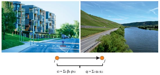 For example, in the case of flooding effects, for (i.e., river closeness), suitable variables belonging to are river or canal distances from link l. Similarly, for (i.e., land features), suitable variables belonging to are land slope and permeability of the land in the neighborhood of link l (i.e., at a suitable, prefixed distance). In the case of earthquake effects, for (e.g., level of urbanization), suitable variables belonging to are building density along the road (i.e., link l) and building heights (Figure 1).