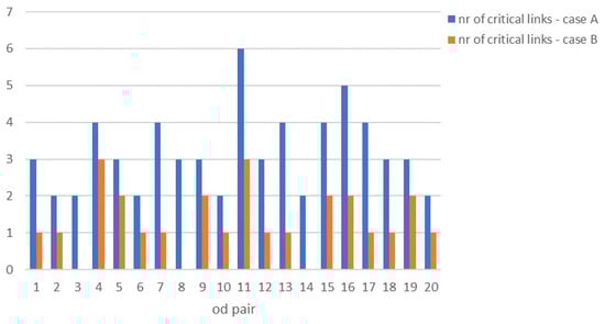 Comparison of the results: number of critical links per paths for each (case A: assignment considering only ; case B: assignment considering the full features of the A-links).