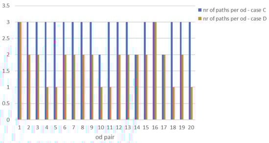 Comparison of the results: number of paths per (case C: assignment considering only ; case D: assignment considering the full features of the A-links).