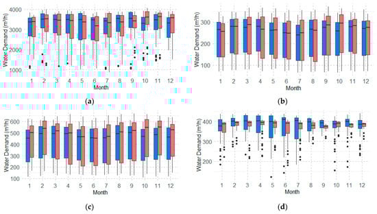 The variation in the monthly water demands across the sub-feeders is depicted in Figure 4. A significant change in water net inflow is observed, evidenced by clear differences in the boxplots when comparing the pre-pandemic and pandemic periods. These variations involve shifts not only in the average values but also in the quartiles, suggesting that short-term policies and climatic factors jointly affected the water net inflow and intake of secondary feeders during the COVID-19 pandemic. By highlighting how socio-behavioral changes interact with climate variables, these findings provide insights into the broader mechanisms that shape urban water demand.