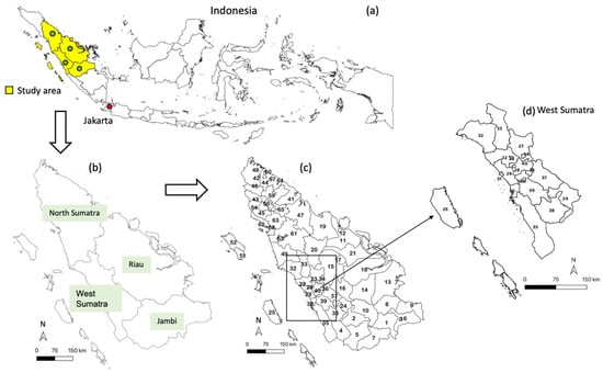 Maps of (a) Indonesian (b) study area in four provinces (c) and the 65 cities or districts in those four provinces. (d) West Sumatra Province, Indonesia. The numbers indicate city or district codes, and the arrows represent zoomed-in views of the study area.