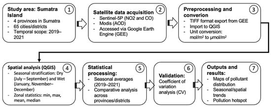 The use of zonal statistics for validation provides a robust approach in the absence of ground data, ensuring that the observed trends are accurate and reflective of the true spatial and temporal variations in air pollution across the study area. By calculating the CV for pollutants such as NO2, CO, and AOD across different districts, we assessed the consistency and reliability of satellite-derived data. Although absolute values could not be validated due to the lack of ground-based monitoring, comparisons among districts and provinces support the observed seasonal and spatial patterns. The methodological workflow for satellite-based air pollution analysis in Sumatra Island is summarized in Figure 2 below.