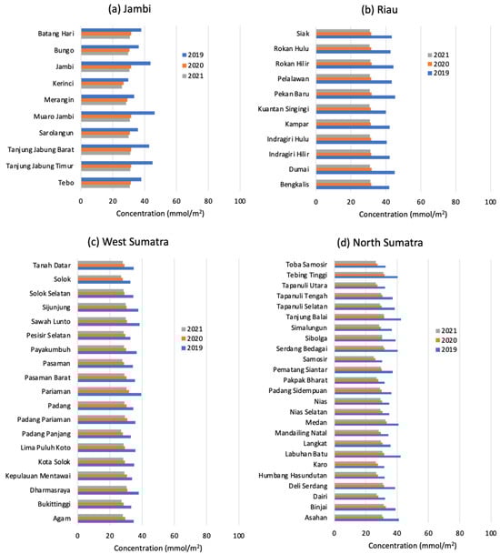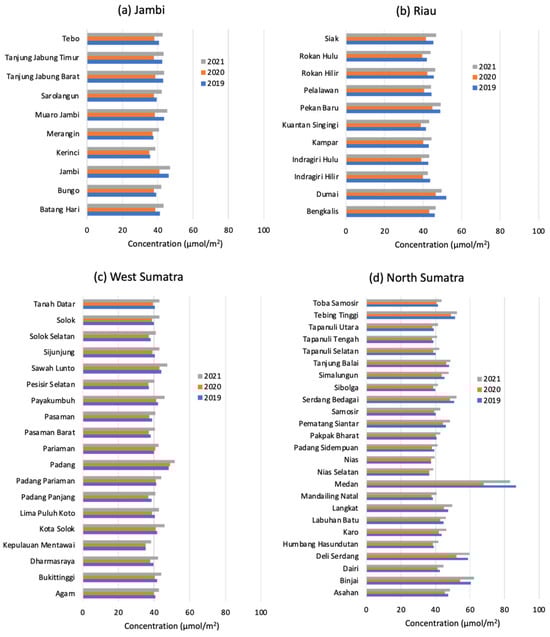 As illustrated in Figure 7, Figure 8 and Figure 9, the NO2 hotspots were located primarily in the urban and industrial areas, particularly in the capitals of each province. Medan in North Sumatra, Pekanbaru in Riau, Padang in West Sumatra, and Jambi in Jambi Province exhibited the highest levels of NO2 compared to the other districts within each province. This correlates well with the hotspot of night-time light data from VIIRS, as shown in Figure S4 and as explained in the previous section.