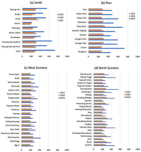 The second province, West Sumatra, is distinguished by its hilly topography and has experienced recent volcanic eruptions [52,53]. Compared to Medan, Padang—the capital of this province—is smaller, and the industrial activities are not as intensive. The Padang cement factory, located in the city, is one of the largest factories in the province and an important source of air pollutants, particularly particulate matter [54,55]. Furthermore, the third province, Jambi, is located in the central-eastern region of Sumatra and is mostly characterized by extensive tropical rainforests. This province is a site for oil and natural gas extraction, activities that might impact air quality [56]. Jambi also has very large peatland areas that are commonly burned during the dry season, both naturally and man-made, for land clearing [57,58]. The last province, Riau, is renowned for its significant contribution to the palm oil sector in Indonesia. The province experiences significant air pollution problems mostly due to forest and peatland fires, which are common during the dry season [59,60]. These fires frequently occur because of land-clearing for agricultural purposes [59]. Pekanbaru, the capital of this province, is smaller than Medan but larger than Padang and Jambi in terms of population density.
