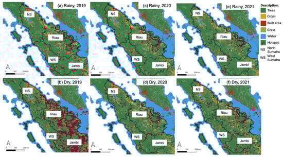 Land use and landcover overlap with the hotspot maps during (a) Rainy, 2019; (b) Rainy 2020; (c) Rainy 2021; (d) Dry, 2019; (e) Dry, 2020; and (f) Dry, 2021 on Sumatra Island, Indonesia.