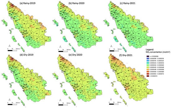 Spatial distribution of NO2 in four provinces of Sumatra Island, Indonesia: (a) Rainy, 2019; (b) Rainy 2020; (c) Rainy 2021; (d) Dry, 2019; (e) Dry, 2020; and (f) Dry, 2021.
