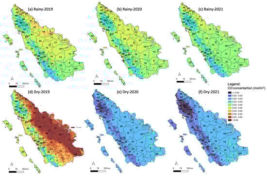 Spatial distribution of CO in four provinces of Sumatra Island, Indonesia: (a) Rainy, 2019; (b) Rainy 2020; (c) Rainy 2021; (d) Dry, 2019; (e) Dry, 2020; and (f) Dry, 2021.