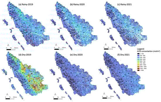 Spatial distribution of AOD in four provinces of Sumatra Island, Indonesia: (a) Rainy, 2019; (b) Rainy 2020; (c) Rainy 2021; (d) Dry, 2019; (e) Dry, 2020; and (f) Dry, 2021.