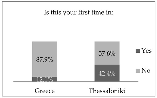Figure 2 shows that only 12.1% were first-time visitors to Greece, while 87.9% had been there before. For Thessaloniki, 42.4% were first-time visitors, and 57.6% had visited previously. This suggests that Greece is a familiar destination for most, but Thessaloniki is less familiar.