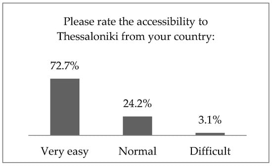 As shown in Figure 3, the majority of participants (72.7%) found accessibility to Thessaloniki from their country to be “Very easy”, indicating a high level of convenience in reaching the city. Another 24.2% rated accessibility as “Normal”, while a small portion, 3.1%, described it as “Difficult”. These results suggest that Thessaloniki is generally easy to access for most international visitors, though a few may encounter challenges depending on their location or available travel options.