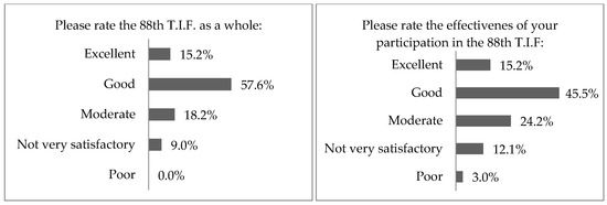 The results show that most participants were generally satisfied with the 88th T.I.F. and the effectiveness of their participation (Figure 4). Specifically, 57.6% rated the fair as “Good”, with 15.2% rating it as “Excellent”. For participation effectiveness, 45.5% rated it as “Good” and 15.2% as “Excellent”. While satisfaction was largely positive, fewer participants rated their experience as “Excellent”, suggesting that there is room for improvement in delivering an outstanding experience and enhancing the effectiveness of participation.