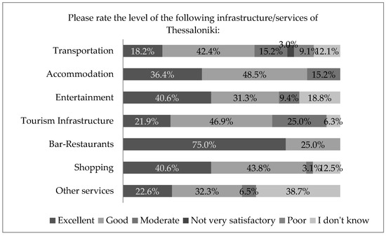 The assessments for Thessaloniki’s infrastructure and services show a generally positive perception (Figure 5). Bar-restaurants received the highest approval, with 75% rating them as excellent. Accommodation, shopping, and entertainment also performed well, with high percentages in the “Excellent” and “Good” categories. Transportation received mixed feedback, with 9.1% rating it as poor, while tourism infrastructure had more moderate ratings. A notable portion of respondents expressed uncertainty about “Other services”, with 38.7% selecting “I don’t know”. Overall, Thessaloniki’s core services are well-regarded, though there is room for improvement in transportation and lesser-known services.