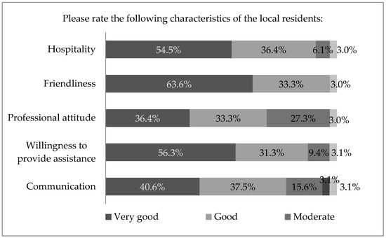 The local residents of Thessaloniki were highly rated in several characteristics (Figure 6). Hospitality and friendliness received the strongest evaluations, with 54.5% and 63.6% rated as “Very good”, respectively. Willingness to provide assistance was also positively rated, with 56.3% marking it as “Very good”. Professional attitude had a more varied response, with 36.4% “Very good” and 27.3% “Moderate”. Communication was also well-regarded, though with slightly more moderate ratings (15.6%). Overall, residents are viewed favorably, especially for their friendliness and hospitality.