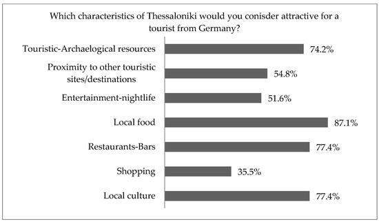 Figure 7 indicates that the most attractive feature of Thessaloniki for German exhibitors is local food, with 87.1% considering it appealing. Restaurants and bars, along with local culture, also score high at 77.4%. Touristic and archaeological resources attract 74.2% of respondents, followed by proximity to other touristic areas at 54.8% and entertainment or nightlife at 51.6%. Shopping is the least attractive characteristic, with only 35.5% finding it appealing. These data suggest that German business tourists have a strong preference for cultural, culinary, and historical experiences in Thessaloniki.
