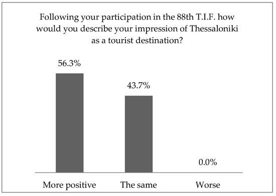 Figure 8 shows the impact of participating in the 88th T.I.F. on visitors’ perceptions of Thessaloniki as a tourist destination. After the event, 56.3% of participants reported a “more positive” impression of the city, while 43.7% felt their impression remained “the same”. No respondents indicated a “worse” impression. This suggests that the event had a generally positive or neutral effect on visitors’ perceptions of Thessaloniki as a tourist destination.