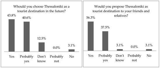 The results (Figure 9) also show that 56.3% would recommend Thessaloniki to others, and 43.8% would revisit it in the future. Additionally, 37.5% are likely to recommend it, and 40.6% are likely to revisit. Only a small portion (3.1%) would not recommend or revisit, with a few unsure. These results indicate a strong positive inclination among participants to both revisit Thessaloniki and recommend it to others, with only a small percentage expressing uncertainty or disinterest.