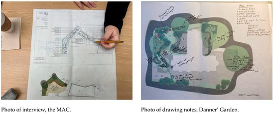 Photos illustrating the drawing interview in action, in the MAC case (left), and the drawing notes for Danner’s Garden (right).