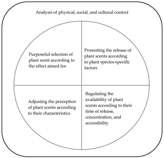 Designing with plant scent should always be seen in relation to the overall aim of the landscape architectural project and its context, including its future users and physical, social and cultural environment. Based on a sensory study of a heritage site, Davis and Thys-Şenocak point out that smell can serve as a catalyst for memories, emotions, and values for individuals and communities [34]. This highlights the value of scent in defining locality and calls for an engagement with future users and their preferences. This integration of user feedback into the design process is relevant both pre-design and post-occupation. Related to the physical context, and in line with the first step of Henshaw’s four-step process, this framework includes a preliminary analysis at the site level [23]. This consists of an analysis of several physical conditions, including sun/shade, temperature, soil, water, wind/shelter, human traffic (where and when), and existing smell sources [25], including odor nuisances [26].