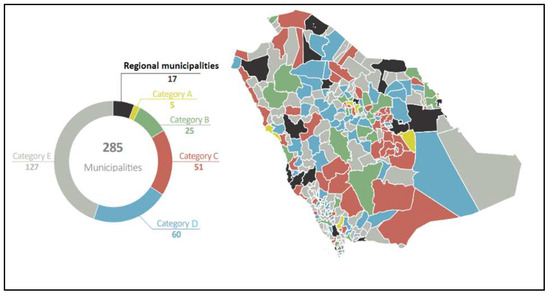 Saudi cities are advocating for greater devolution of planning powers to promote decentralized planning and decision-making, marking a shift from the previously centralized control by MoMRA [7,35]. This shift has granted municipalities more autonomy in developing their own plans [47]. As illustrated in Figure 1, there are currently 285 municipalities in Saudi Arabia, organized by size and function. These municipalities are classified into six categories: ‘Regional’, ‘Category A’, ‘Category B’, ‘Category C’, ‘Category D’, and ‘Category E.’ For instance, there are 17 municipalities in the ‘Regional’ category, 127 in ‘Category E’, 60 in ‘Category D’, 51 in ‘Category C’, 25 in ‘Category B’, and 5 in ‘Category A’ [40]. Municipalities in Category A possess the highest level of authority, granting them greater decision-making power and autonomy in shaping urban development strategies, particularly in larger urban centers. This classification reflects varying degrees of decentralization and administrative capacity, with Category E municipalities having the least autonomy.