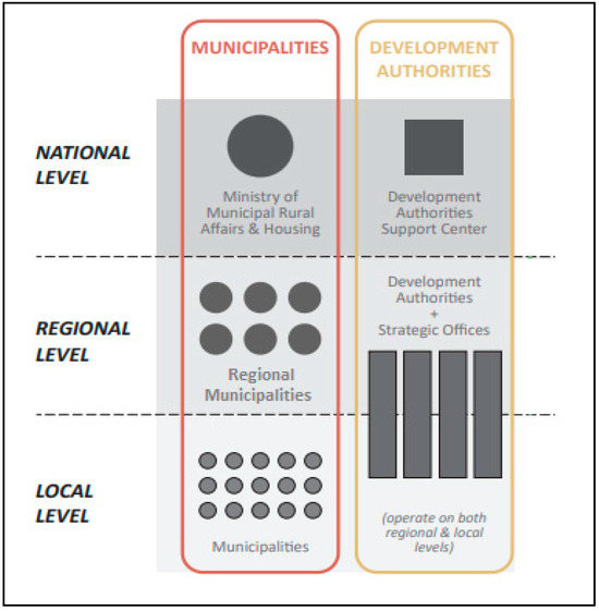Structured overview of urban governance levels in municipalities and regional development authorities. Source: [40].