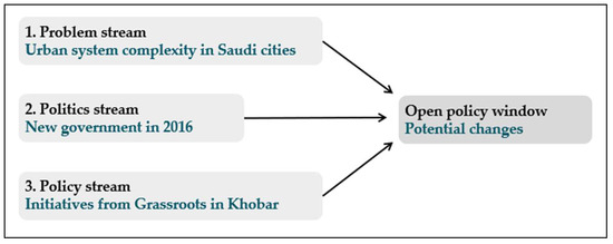 Understanding this concept is central to explaining how and why certain issues rise to the political agenda and how policy change occurs. Kingdon’s policy window model specifies three streams—problems, politics, and policy—which help explain policy change. In the Saudi context, these streams are evident in the policy changes studied here. As shown in Figure 3, the problems stream relates to the complexity of the urban system, the politics stream corresponds to the arrival of the new government in 2016, and the policy stream reflects the participatory initiatives from grassroots movements in Saudi Arabia. Gaining more insight into the transformational shifts within Saudi urban planning highlights how these streams of problems, politics, and policy are directly connected to institutional and policy changes within the Saudi Arabian context.