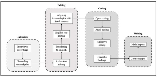 As shown in Figure 5, the interviews were carried out using a systematic process that involved implementation, analysis, and summarization. During the interviews, recordings were made, and transcriptions were automatically generated. Once the transcripts were stored, the editing process began with Arabic text editing. The text was then translated into English, and content editing was conducted to ensure that all terminologies aligned with the context of Saudi Arabia. This stage included open coding, followed by axial coding, and finally selective coding using ATLAS.ti9 (Computer Assisted Qualitative Data Analysis Software, CAQDAS), following the guidelines outlined by Friese [50]. This process led to the identification of thematic findings. The final stage of writing involved expressing the core ideas developed through the coding process, culminating in an explanation of the main research impact.
