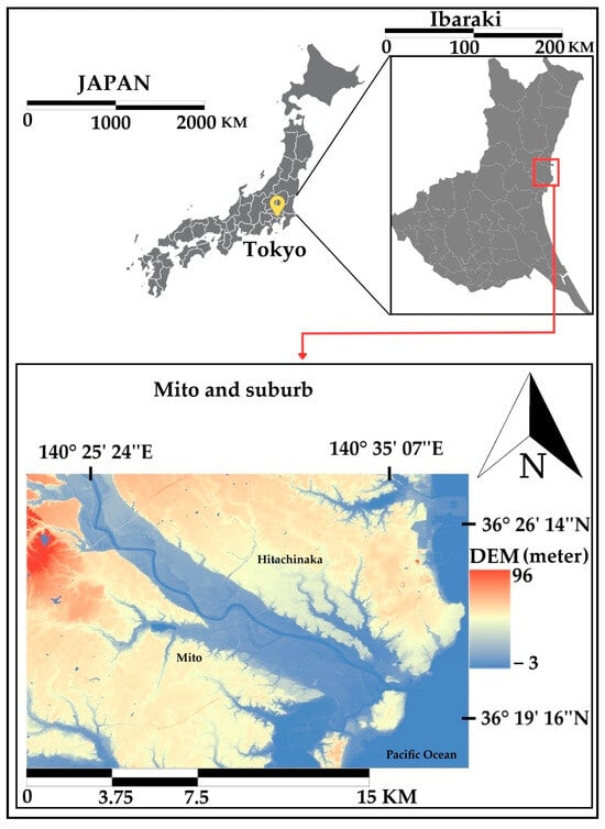 Mito City, the administrative center of Ibaraki Prefecture, lies 100 km northeast of Tokyo at the northeastern edge of the Kanto Plain. Spanning 217.32 km2, it features a diverse landscape that includes the Naka River, Lake Senba, historic landmarks like Kairakuen Garden, and urban centers surrounded by lush greenery. The city’s terrain consists of lowlands along the Naka and Sakura Rivers, central plateaus supporting agriculture and urban areas, and hills in the northwest extending into the Yamizo Mountain Range. Bordering Hitachinaka City, Naka City, and Shirosato Town to the north and Oarai Town, Ibaraki Town, and Kasama City to the east, south, and west, Mito offers a harmonious blend of natural beauty and urban development. As of 1 January 2024, the city had an estimated population of 268,036 in 126,055 households and a population density of 1233 persons per km2. Although its aging rate of 27.2% is below the prefectural average of 29.9%, the city faces ongoing challenges of a declining birth rate and an aging population, indicating potential for urban shrinkage. Additionally, the prefectural plan identifies Mito City as vulnerable to large-scale natural disasters, including earthquakes, tsunamis, typhoons, and heavy rain-induced floods []. This combination of climate-induced disaster risk and urban decline makes the city a suitable case study for this research. The study area’s location is shown in Figure 1. Notably, all figures in this study share the same spatial extent, with latitude and longitude provided in the study area map.