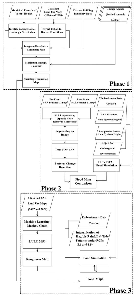 To feasibly generate a map that jointly identifies buildings at risk from future floods and areas with decay potential, three key components are required. However, our evaluation of the literature reveals lacunae in these aspects. The first gap lies in insufficient attention to micro-scale shrinkage transitions and vacancy patterns, leading to a critical shortfall in localized prediction accuracy and the redefinition of urban decay’s spatial heterogeneity. Second, before applying forward modeling for future flood scenarios, it is crucial to assess the accuracy dimensions of such flood simulators. Yet, existing studies often overlook the evaluation of real-time hydrodynamic simulation tools as forward modeling, compared to SAR-based deep learning techniques as result-based inundation mapping. The third research gap concerns the limited capacity to predict the impacts of future climate scenarios on Typhoon Hagibis-like events along the Naka River and its suburbs. This limitation hinders effective flood risk management by overlooking emerging risk zones and adaptation opportunities under escalating climate conditions. Addressing these aspects collectively allows for a comprehensive mapping of Japan’s urban and environmental exposures, which is crucial for enhancing resilience.