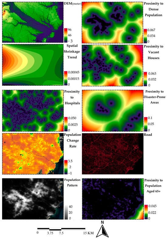 Building on this statistical framework, the transition potential map quantifies the likelihood of changes at the building level, from occupancy to vacancy or deterioration. In the analysis, shrinkage is treated as the dependent variable, while a collection of predictor variables functions as independent: distance to areas with a significant population of individuals aged 65 and older, accessibility to hospitals, proximity to densely populated zones, nearness to high-risk regions, the layout of the road network, the spatial distribution of the population, rates of population change, and information derived from a DEM. By feeding these inputs into a Maximum Entropy classifier within the TerrSet 2020 IDRISI software, we capture the statistical relationships driving urban decay and project where shifts are most likely to occur. The resulting probability surface highlights emerging hotspots of decline, offering a granular view of how and where shrinkage may unfold under existing or anticipated conditions. Figure 3 showcases six instances of vacant houses using Google Street View, and Figure 4 highlights the predictor variables.